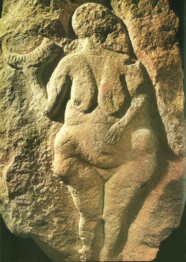 史前艺术中的女性,还有浮雕《持牛角杯的维纳斯》。浮雕突出的依然是女性的生育功能,乳房、臀部、肚子等等。所不同的是她拿着一只牛角。史前人不知道人为什么会生育,于是她虔诚地向牛角祈求,让自己多生育。从这个作品可以看出,在当时的社会中,女人是否多生育能决定她在部落中的地位。
