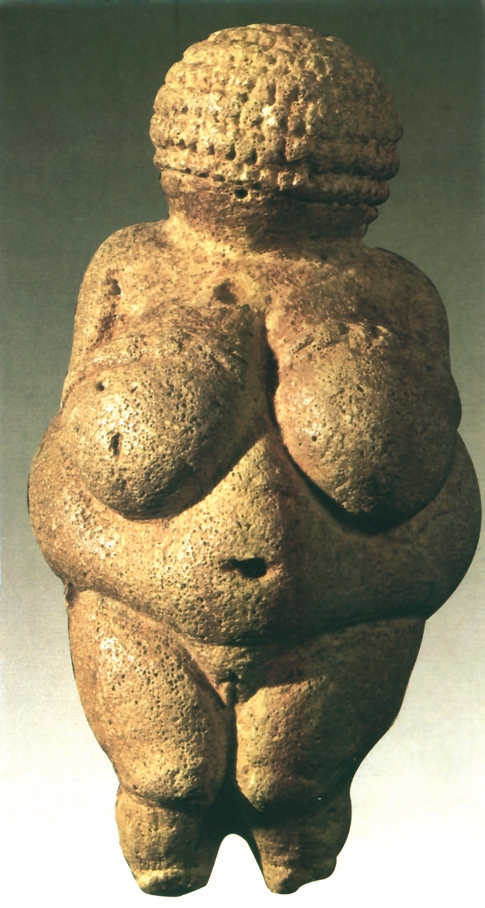 《奥林多夫的维纳斯》,这是距今4万年前的作品,出土于奥地利的奥林多夫。这种雕像,有人把她叫做生殖女神,也有人把她叫做维纳斯。因为,在希腊罗马的神话中,主管爱情、婚姻、生育以及一切动植物生长繁殖事宜的女神,就叫做维纳斯。类似的作品还很多,大多是女性裸体,把女性的生育特征作极度的夸张:一对庞大的高高耸起的乳房,堆积着厚厚脂肪的滚圆的腹部,腹部松弛的肌肉叠压在大腿上,深深的肚脐巧妙地利用了石头的天然石孔,丰腴宽阔的臀部,从背部望去,骨盆和腰椎衔接的地方有凸起的皱褶,表现出肌肉的质感。所以这些,都把一个有旺盛生育能力的妇女形象夸张地、生动地刻画出来。雕像大胆地省略与生育无关的特征:胳膊通常是没有的,或者雕刻得很模糊,两臂弯曲着,两手放在硕大的乳房上。脚是没有的,大腿合并在一起,膝盖以下呈锥形或棒形。头是一个圆球,今天的人们对女性的面部是否秀美十分关心,但是,在原始人看来,一个女性的面部是否秀美,是根本不值得重视的。所以,雕像用精心雕琢的头发,盖住了她的面部。