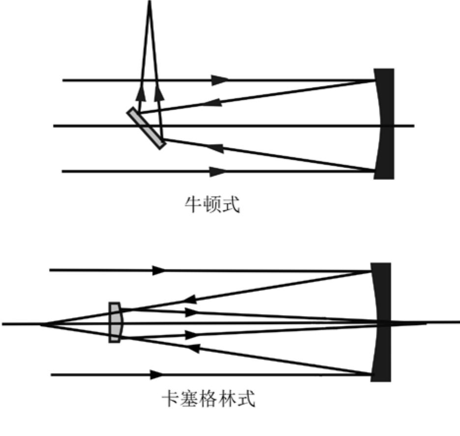 在反射望远镜中,物镜是一凹镜,安置在镜筒最下端。它将星光反射到接近镜筒上端的焦点上去。现在产生了必须解决的困难:要看焦点上的像,观测者必须从上面向镜中望去。如果他俯在镜筒上看,他便要看到他自己的影子在镜中了。他的头和肩都会遮去大部分射来的星光。因此必须想出方法来使焦点到筒外去,才能充分测得星的像。不同的方法结果造成不同形式的反射望远镜。现在应用的有主焦点系统、牛顿系统、卡塞格林系统、格雷果里系统、折轴系统等。本章介绍其中的两种:一是牛顿式(Newtonian),二是卡塞格林式(Gassegrainian)。