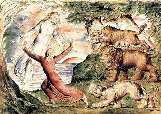 野兽作为阻碍朝圣者直接攀上光明的顶峰的对立面出现,象征着人性中自我的3种心理状态。豹、狮、母狼——分别象征人性的野心、贪欲和自大——都很饥饿,并且逃避不开。意识到自己的无助,朝圣者开始退却,这时他的向导出现了。维吉尔将带领他通过“一个永恒的地方,在那里你会看见痛苦中的已往的灵魂”,然后到达一个“安于火中的灵魂们”居住的王国(I,116,118—119);然后,维吉尔告诉他,一个更相称的灵魂会继续引导他。评论家密尔顿·科隆斯卡指出,对威廉·布莱克来说,但丁红色的袍子象征激情,向导的蓝袍则象征想象。布莱克的具有立体感的野兽比手抄本绘画更具有活力。