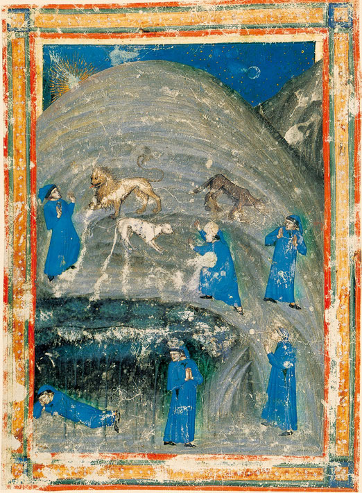 这幅已经严重损坏的画,呈现出一种中世纪手抄本绘画少有的空间透视感。把中心人物的不同行为表现在不同的地方是一种传统技法。朝圣者在黑森林中醒来,然后开始攀登小山(那里同时画着太阳和月亮),遇到野兽。