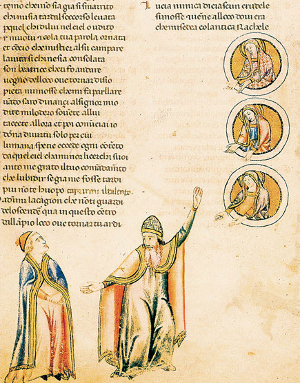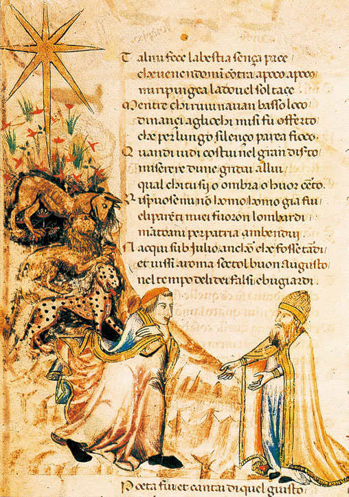 在这本比萨手抄本中,维吉尔揭示派遣他来到这里的三位女性。维吉尔说,玛利亚召来露西亚,露西亚召来贝雅特丽齐,贝雅特丽齐再来到维吉尔面前。贝雅特丽齐慈悯地劝说而不是命令维吉尔来到朝圣者面前。