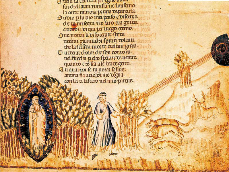 在绝望中,我的眼前出现一个模糊的人影,分不清是人是鬼。我向他叫喊起来:“救救我吧,快帮我把这只母狼赶开!”原来他就是我深深崇敬的古罗马诗人维吉尔的灵魂。他对我说:“为什么你不去攀上那座愉悦的山峰 (注:维吉尔一语双关,山峰象征着灵魂的净化,所以用“愉悦的”来修饰) ——所有快乐的源泉和起因,而要回到这可悯的悲惨中?”然后他又说:“要是你想离开这片荒野的话,另一条道路你必须选择。这只使你惊叫的野兽,不许任何人经过她的道路。她的本性凶残而贪婪,进食只会使她更加饥饿。她不断地和各种生灵交配并且会交配得更多,直至那只集智慧、爱与美德 (注:指三位一体:智慧——圣子;爱——圣灵;美德——圣父) 于一身的猎犬对她施以痛苦的死亡。”