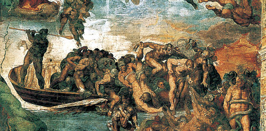 把多雷的《横渡阿克伦河》和米开朗基罗的这幅《最后的审判》(局部)进行对比对多雷来说也许不公平。在米开朗基罗这幅极具力量感和表现人生本质的辉煌巨作面前,多雷的画似乎失去了力量。米开朗基罗的作品是为西斯廷礼拜堂天顶所做的壁画,构图和多雷的这幅图并不完全相同(米开朗基罗的作品更加包罗万象),但是我们知道米开朗基罗对但丁的《神曲》同样很赞赏,并且也许受了它的影响(传说米开朗基罗曾经在一本《神曲》的页面空白处画了很多插图,这本书后来在一次海难中遗失了)。多雷的才能表现在他对黑暗的把握上——这一点和但丁诗中反复强调的一致。