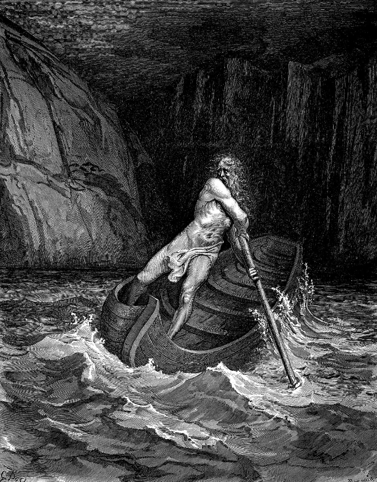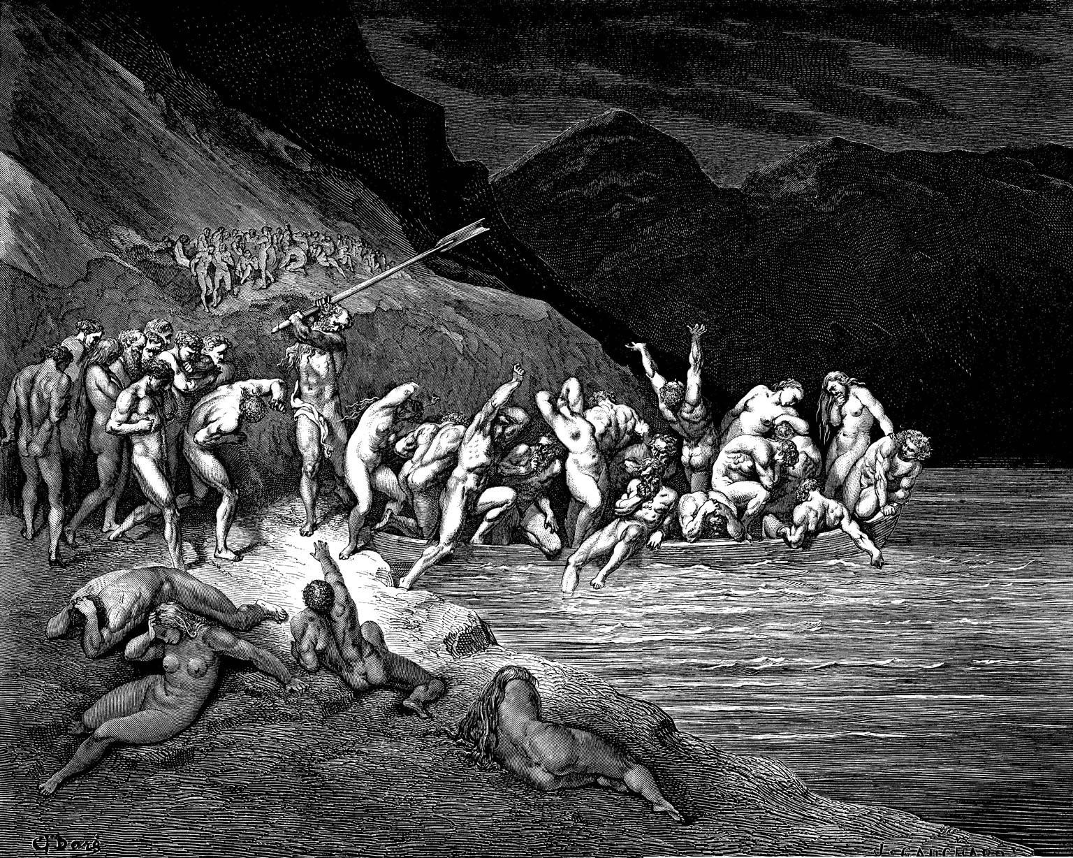 于是所有的鬼魂们纷纷上船,呼喊着,紧咬着牙齿诅咒上帝、自己的父母以及人类,然后是他们自己受孕和出生的时间和地点。他们挤成一团,而卡隆,用他的桨打着探向外面的人。就这样,他们渡过了发暗的河。他们还没有到达远处的对岸,新的一群就又在这边的岸上聚集。
