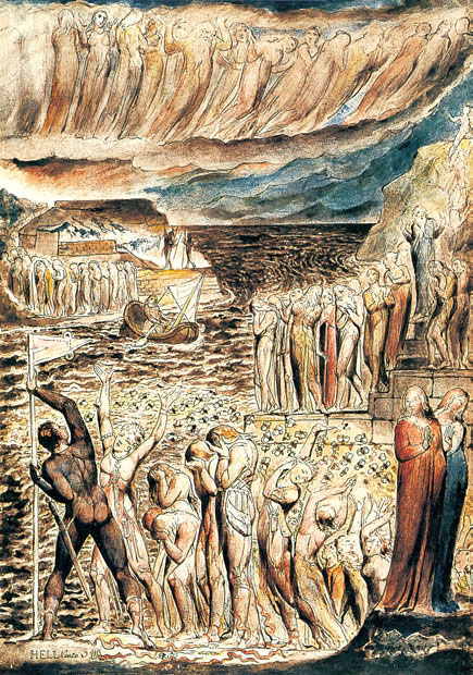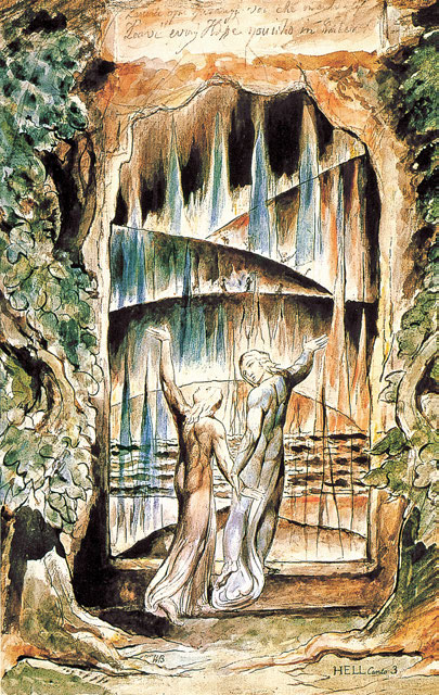 这幅中世纪的比萨手抄本绘画比布莱克的绘画(下图)更强烈地表现出个人在地狱入口处的体验,尽管他用猫头鹰和蝙蝠(但丁的文中没有提及)做了暗示。中世纪绘画具有强烈的感染力;虽然有时以现代眼光来看它的幼稚的形象有些可笑,但它们确实传达出日常生活中经常会遇到的各种情况。
