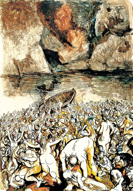 魔鬼卡隆,用炭火般的眼睛,示意着他们全都上船;他用桨打着探向外面的人。(III,109—111)