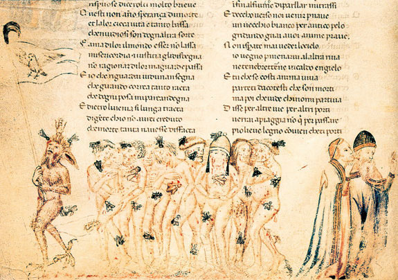 我们可能都做过陷入蛇群或者虫堆中的噩梦。在这幅比萨的手抄本绘画中,没有立场的罪人被马蝇和黄蜂蜇刺,不断地哀号、咒骂、流血。他们可能企图纠缠但丁,因此维吉尔急忙把他拉开。由于他们的罪,他们既不被天堂,也不被地狱接受。