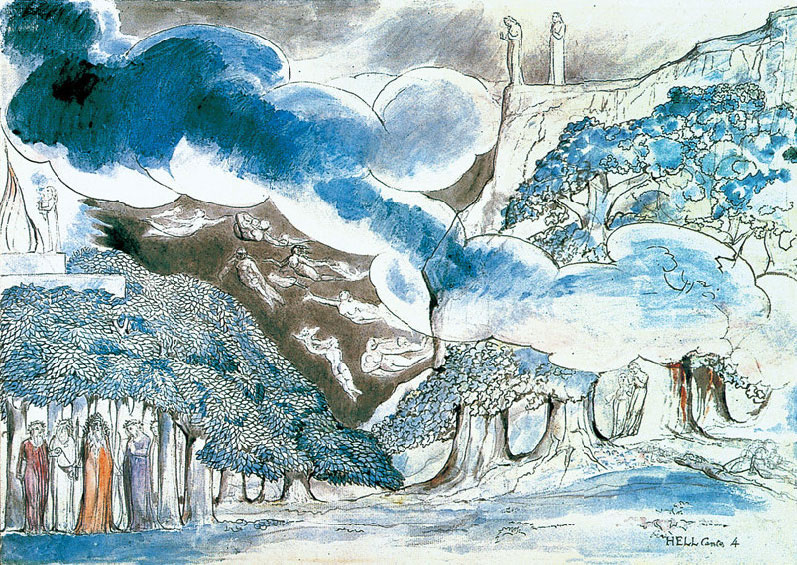 在布莱克眼里,但丁所描绘的林勃——异教徒的领域中,妇女和儿童的灵魂在空中漂浮;一个美丽的草地上,大诗人们在优美的树下聚会。在接近地狱第一圈(维吉尔也居住在这里)时,朝圣者弄错了维吉尔脸上苍白的表情。维吉尔纠正了他,说:“下面那些人的痛苦,在我的脸上显现出你误以为是恐惧的怜悯”(IV,19—21)。尽管这些灵魂具有崇高的美德,但是他们“没有进入你所信奉的宗教的大门”(IV,36),因此“我们没有希望却生活在希望中”(IV,42)。评论家大卫·拜德曼说画中的黑云是布莱克用来表示异教徒距离天堂的距离。