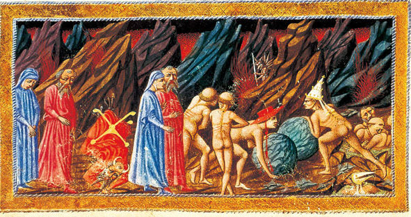 在吝啬及浪费者居住的地狱第四圈,维吉尔咒骂拦道的普鲁托(希腊神话中的财神):“让你的报复吞噬自己吧!”普鲁托像折断的桅杆一样立刻消失了。两队灵魂用他们的胸部沿着相反的方向推动重物,他们相遇时就互相咒骂:“你为什么积聚?”“你为什么挥霍?”维奇他让吝啬者和浪费者推动相同的重物,象征着金钱是使他们堕落的同样的理由。