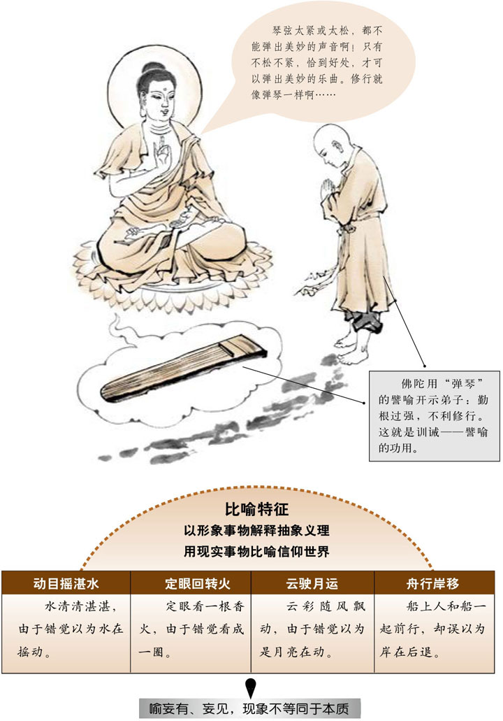 比喻是一种修辞,指借彼物喻此物。佛教经典千差万别,内容又非常丰富,从文体与内容的类别可以分为12种:契经、应颂、讽颂、因缘、本事、本生、未曾有、譬喻、论议、自说、方广、授记,称“十二分教”。其中,本生、因缘、譬喻是最常见的经文构成方法。本生是佛陀累世的故事,佛陀在菩萨时代做过国王、大臣、商人、天神乃至动植物等。这些经历和故事就称为“本生”,主要有《生经》和《六度集经》。因缘是指说法时,在某种因缘条件下,说出一种序文式的故事,相当于“缘起”,也有指释尊从过去世修行直至今生成道的种种因缘故事,相当于“本生”。譬喻原本是指由因缘而来的教训式故事,后来泛指“训诫的故事”,或简称为“故事”,即具有轻松意味的寓言,如《百喻经》、《杂譬喻经》。从这三种方式来看,佛陀说法喜欢将两类或两类以上事物的类似之处加以对比,化深奥之理为浅俗之事,以扩大接受对象。这也就是比喻说理,形象生动,通俗易懂,如大乘经中的《金刚经》六喻、《法华经》七喻、《仁王经》八喻、《维摩诘经》和《如来藏经》各十喻等,以达到“寄浅训深”的效果。