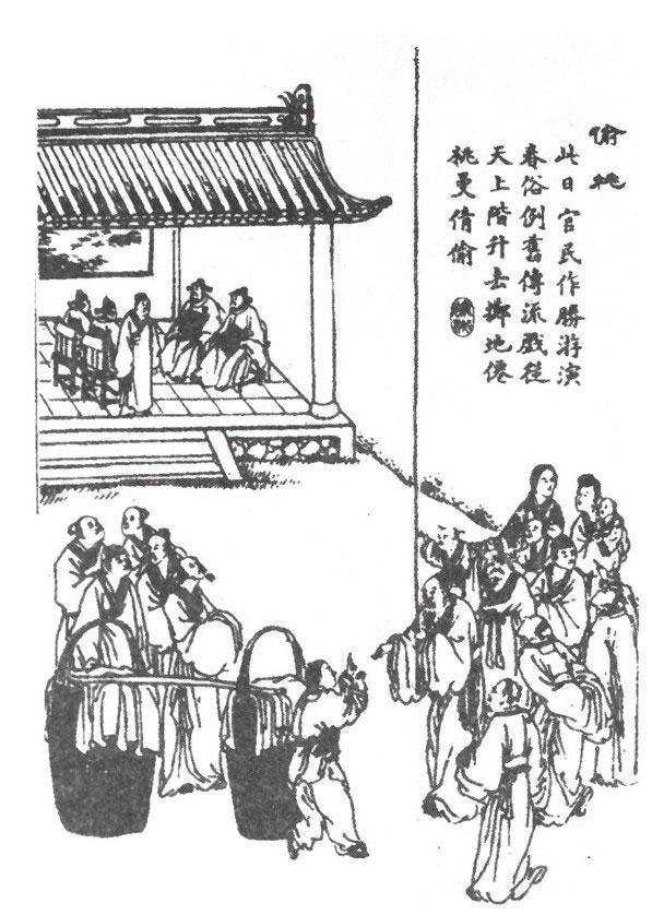 是日游人如堵。堂上四官皆赤衣,东西相向坐,时方稚,亦不解其何官,但闻人语哜嘈,鼓吹聒耳。忽有一人率披发童,荷担而上,似有所白;万声汹涌,亦不闻其为何语,但视堂上作笑声。即有青衣人大声命作剧。其人应命方兴,问:“作何剧?”堂上相顾数语,吏下宣问所长。答言:“能颠倒生物。”吏以白官。少顷复下,命取桃子。