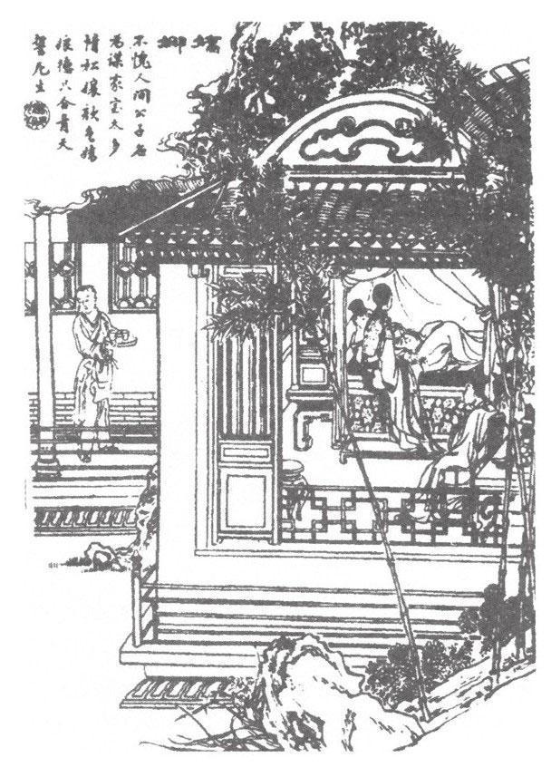 时盛暑溽热,移斋园亭。生胸间肿起如桃,一夜如碗,痛楚呻吟。公子朝夕省视,眠食俱废。又数日创剧,益绝食饮。太翁亦至,相对太息。公子曰:“儿前夜思先生清恙,娇娜妹子能疗之,遣人于外祖母处呼令归。何久不至?”俄僮入白:“娜姑至,姨与松姑同来。”父子即趋入内。少间,引妹来视生。年约十三四,娇波流慧,细柳生姿。生望见艳色,嚬呻顿忘,精神为之一爽。公子便言:“此兄良友,不啻同胞也,妹子好医之。”女乃敛羞容,揄长袖,就榻诊视。把握之间,觉芳气胜兰。女笑曰:“宜有是疾,心脉动矣。然症虽危,可治;但肤块已凝,非伐皮削肉不可。”乃脱臂上金钏安患处,徐徐按下之。创突起寸许,高出钏外,而根际余肿,尽束在内,不似前如碗阔矣。乃一手启罗衿,解佩刀,刃薄于纸,把钏握刃,轻轻附根而割,紫血流溢,沾染床席。生贪近娇姿,不惟不觉其苦,且恐速竣割事,偎傍不久。未几割断腐肉,团团然如树上削下之瘿。又呼水来,为洗割处。口吐红丸如弹大,着肉上按令旋转。才一周,觉热火蒸腾;再一周,习习作痒;三周已,遍体清凉,沁入骨髓。女收丸入咽,曰:“愈矣!”趋步出。