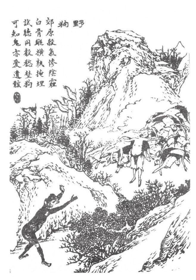 李方惊颤欲起,有一物来,兽首人身,伏啮人首,遍吸其脑。李惧,匿首尸下。物来拨李肩,欲得李首。李力伏,俾不可得。物乃推覆尸而移之,首见。李大惧,手索腰下,得巨石如碗,握之。物俯身欲龁,李骤起大呼,击其首,中嘴。物嗥如鸱,掩口负痛而奔,吐血道上。就视之,于血中得二齿,中曲而端锐,长四寸余。怀归以示人,皆不知其何物也。