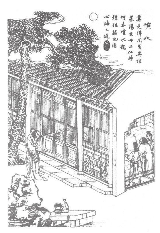 莱阳宋玉叔先生为部曹时,所僦第甚荒落。一夜二婢奉太夫人宿厅上,闻院内扑扑有声,如缝工之喷水者。太夫人促婢起,穴窗窥视,见一老妪短身驼背,白发如帚,冠一髻长二尺许;周院环走,竦急作鹓行,且喷水出不穷。婢愕返白,太夫人亦惊起,两婢扶窗下聚观之。妪忽逼窗,直喷棂内,窗纸破裂,三人俱仆,而家人不之知也。