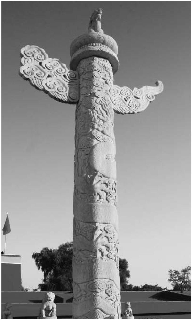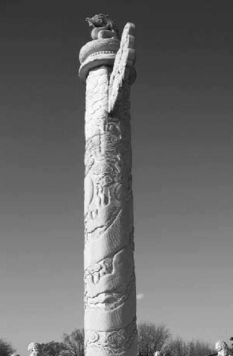 在承天门前后,各矗立有一对汉白玉浑圆精美的雕龙柱子,名叫“华表”,又称“望柱”,始建于明代永乐年间,每对华表间距为96米,每根华表由承露盘、柱身和须弥座柱础组成,通高为9.57米,其直径为0.98米,重约20000千克。