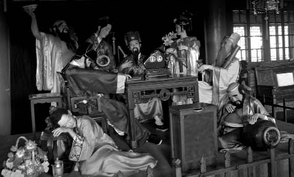 献殿左右连以游廊通向左右10间厢房,其间分别设置10组群像,以真实的故事,生动的形象,展示了“酒”这柄双刃宝剑在我国历史长河中的功过。