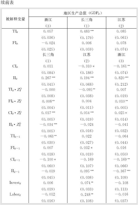 为研究对外开放程度(Z O it )在长三角经济增长过程中所起的作用,本章在(2)式中分别加入其与创新要素集合的交互项,考察在全球化背景下,创新要素集合对城市经济增长的影响。