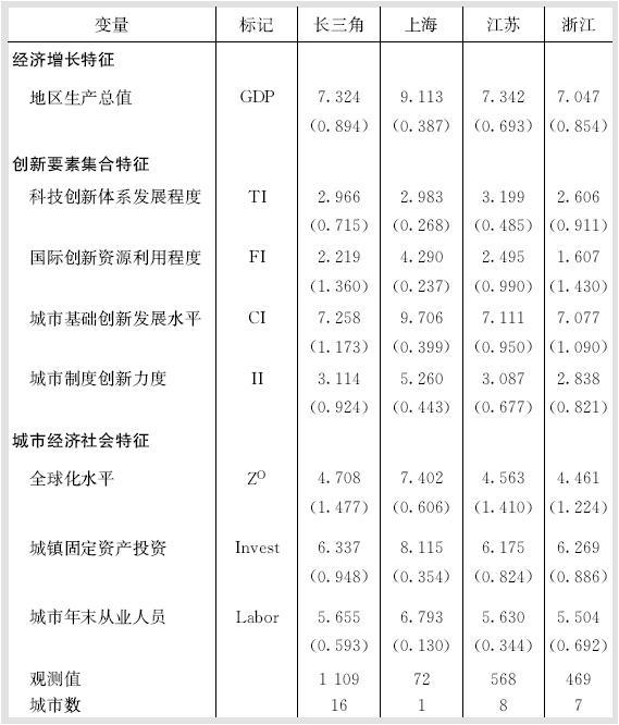 被解释变量采用各城市地区生产总值(GDP it )。主要解释变量包括:科技创新体系发展程度(TI it ),用各类专业技术人员数量来度量;国际创新资源利用程度(FI it ),用外商直接投资度量;城市基础创新发展水平(CI it ),用年末金融机构贷款余额比重度量;城市制度创新力度(II it ),用地方财政一般预算支出中的教育支出度量;对外开放程度或全球化水平(ZO it ),用进出口总额度量,反映生产要素的国际化流动程度。其他解释变量还有,城镇固定资产投资(Invest it )和城市年末从业人员(Labor it )。