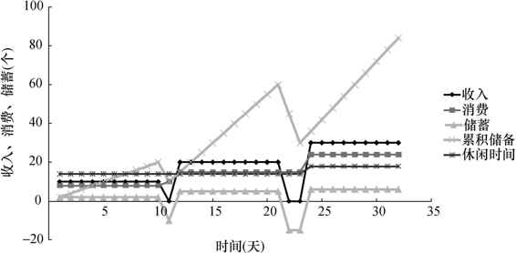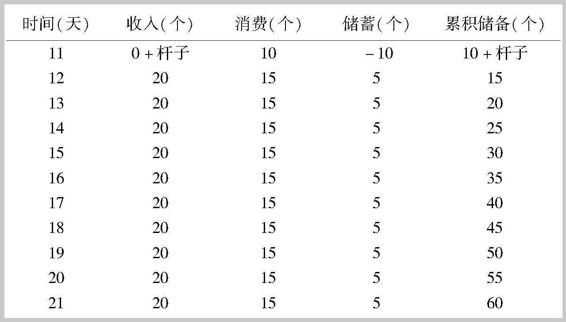 再假定,预期到从第12天起,由于有了新的生产工具,每天工作10个小时可以采摘到20个椰子,收入(产量)比原来翻了一番,鲁滨孙决定在第11天把积累的20个椰子吃掉10个,并且从第12天开始,每天吃15个椰子,储蓄5个。表2-4给出从第11天开始鲁滨孙的经济境况。到第21天的时候,他的总储蓄达到60个椰子,活得更踏实了。