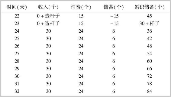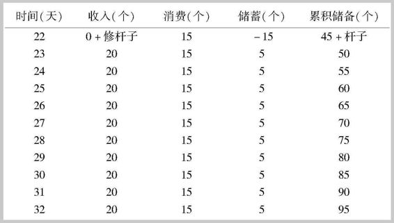 假定杆子最多只能用10天。那么到了第22天,鲁滨孙又需要决定是否再生产一个杆子了。由于此时积累的椰子数量达到60个,他既可以按照第11天的情形,在第22天制作出同样一根杆子(等同于修复旧杆子),也可以选择花更长的时间(2天),做一个更大的投资——生产一个更高质量的杆子,这个高质量的杆子可以让鲁滨孙1个小时摘到5个椰子。如果选择后者,由于工作效率的提高,鲁滨孙从第24天开始可以将工作时间减少到每天6个小时,采摘到30个椰子,这不仅增加了休闲时间,同时还可以把每天消费的椰子增加到24个,储蓄增加到6个。表2-5和表2-6给出了这两种情形的对比。