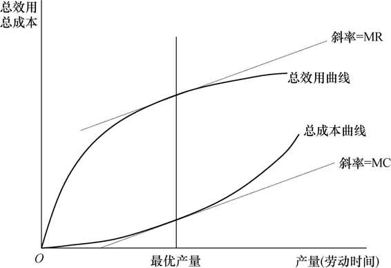 图2-3描述的是更为一般的情况。图中,横坐标代表产量(或劳动时间),纵坐标表示总效用和总成本。总效用曲线和总成本曲线之间的距离代表净收益。总效用曲线的斜率是对应产量下的边际效用,总成本曲线的斜率是对应产量下的边际成本。最优产量在净收益最大点达到,此时,总效用曲线的斜率和总成本曲线的斜率相等,也即边际效用等于边际成本。