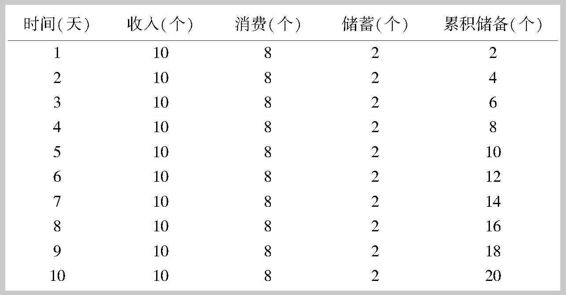 有了这些考虑,鲁滨孙会认识到,把10个椰子都吃掉并不是最好的选择。假定他决定吃掉8个椰子,把另外的2个储存起来。这样的话,按照经济学的术语,鲁滨孙一天的收入是10个椰子,其中8个椰子用于当期的消费,2个椰子变成储蓄。在经济学中,储蓄总是等于收入与消费之差,即 储蓄 = 收入 - 消费 。
