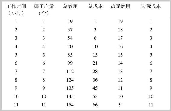 鲁滨孙应该花费多少工作时间采摘多少椰子呢?从表2-2中可以看出,他应该会选择花10个小时采摘到10个椰子。原因就在于,该产量值对应的边际效用等于边际成本,从而恰好使得他的净效用最大化。实际上,以幸福为目的的决策人最关心的既不是总收益,也不是总成本,而是净收益(或净效用)的大小。在这个例子中,总收益表示为总效用,净收益由总效用减去总成本得到,边际净收益(即每增加1单位椰子带来的净效用的变化)等于边际效用减去边际成本。当椰子产量少于10个时,边际效用大于边际成本,此时增加椰子产量会使净收益增长。当椰子产量大于10个时,边际效用小于边际成本,此时降低椰子产量会使净收益增长。只有在椰子产量为10个时,无论增加还是减少椰子的产量都不能使净收益变大了,因此实现了净收益目标的最大化。