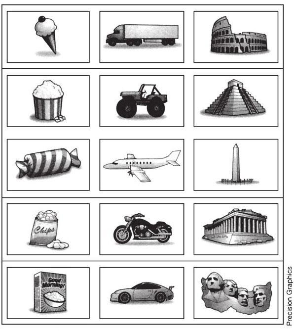 实验对象会先记下这些图片,之后再进行回忆。研究人员为实验对象提供了这4张图片中的一张,要求他们试着回忆起剩下的3张。比如,在实验对象看过上面这些图片之后,可能会这样提问: