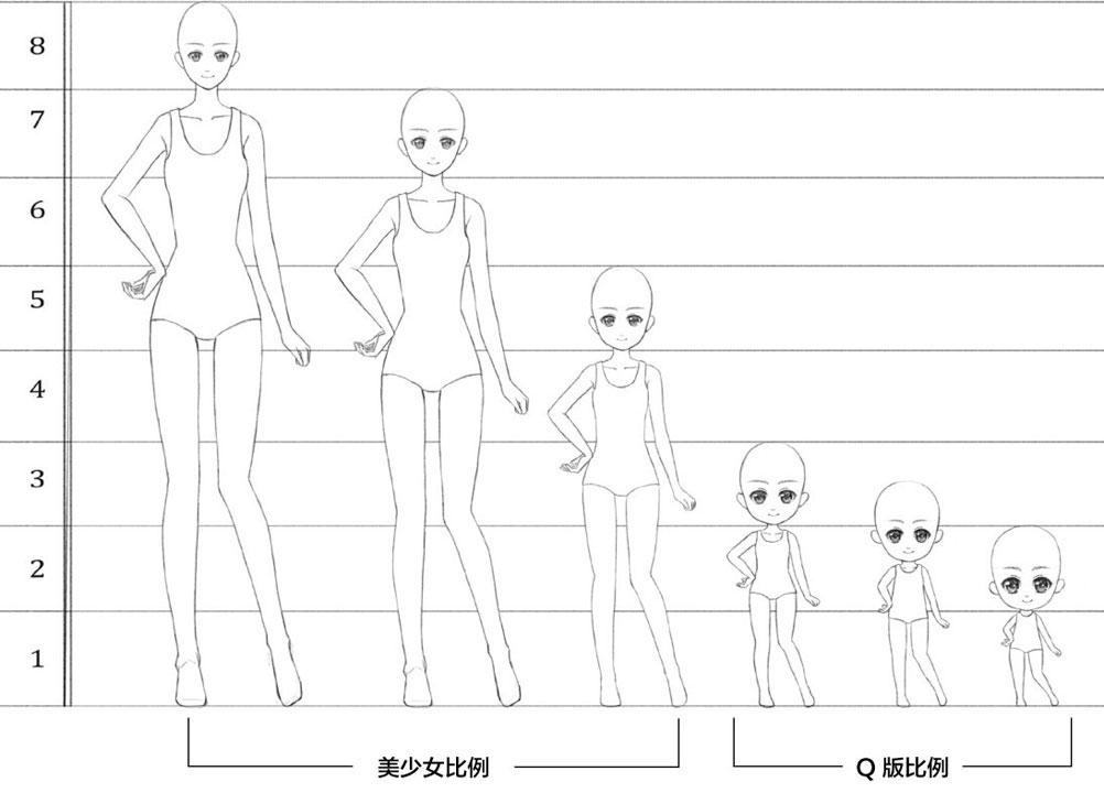 一般情况下,我们用八头身表示大学生、白领等成熟女性;高中女生一般与成年人身高一致,表现窈窕少女时,我们多采用七头身比例;五头身一般用于小学生和少女等年龄偏小的美少女。2~3头身都是Q版的常用比例。