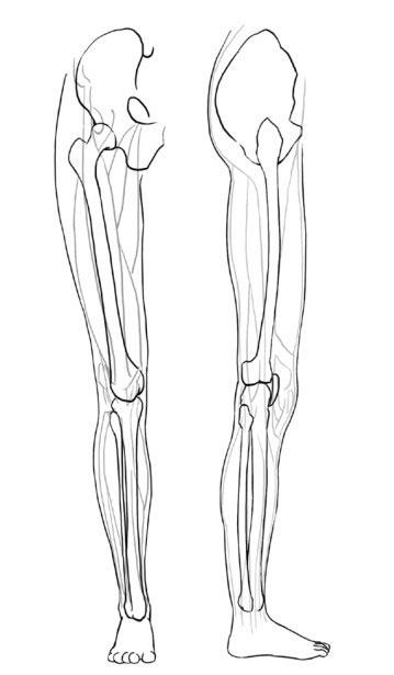 腿部整个结构和手臂差不多,大腿为一根骨头,而小腿是两根。与手臂不同的是,整条腿最粗的部分在接近大腿根部的位置,画腿时一定要注意画出小腿肚的部分,不要直线等宽。