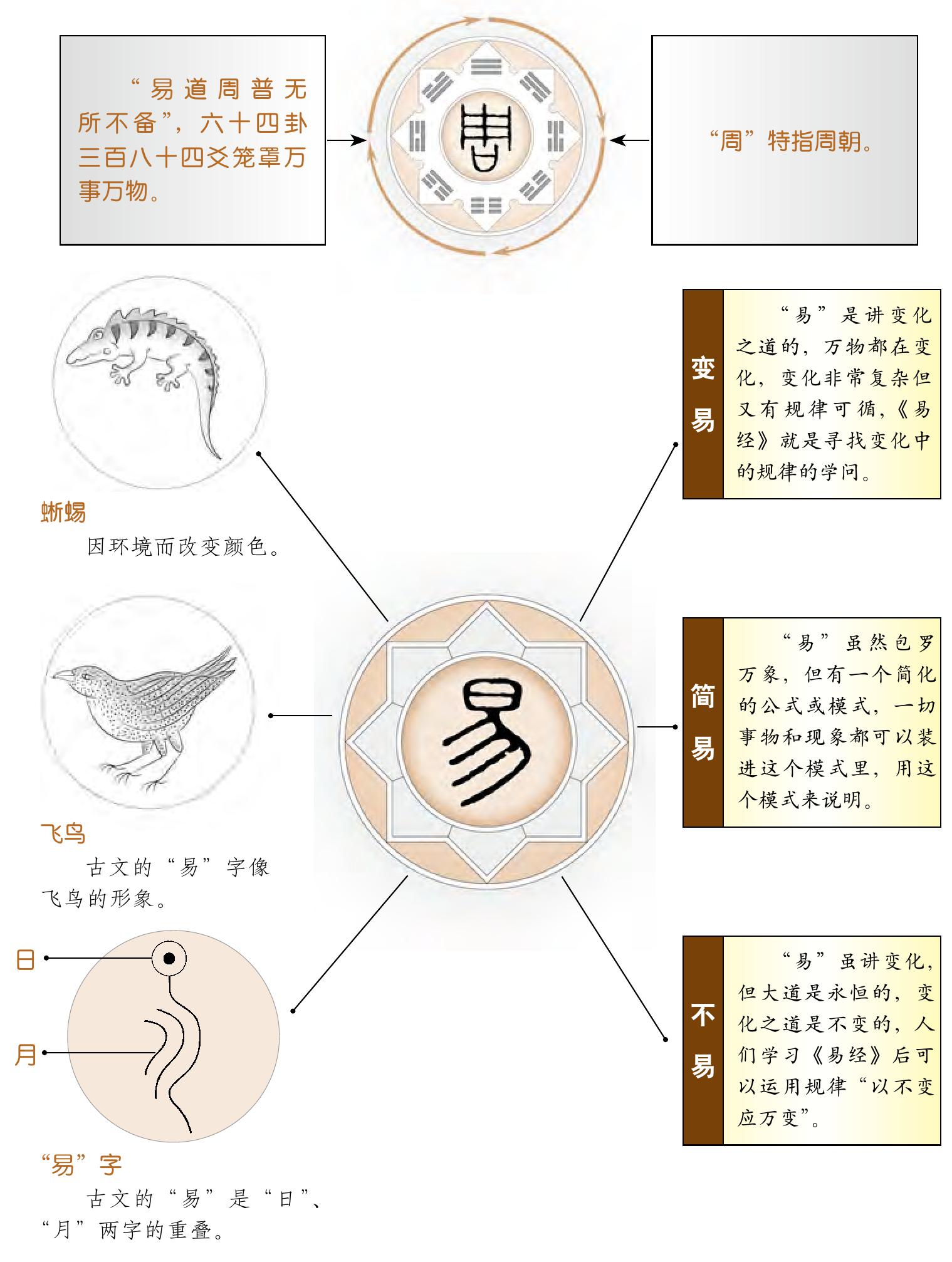 简单来说,《易经》一般又称《周易》。关于《周易》的“周”字,历来有多种说法。有人认为,“周”是“易道周普无所不备”的意思,因为《易经》以“六十四卦三百八十四爻”笼罩万物,卦爻的含义必然具有极其广泛的普适性。也有人认为,“周”特指周朝,是年代的意思。对“易”字的解释则更多,主要包括三种观点:“易”这个字是把“日”、“月”两个字重叠而来的,上面是日,下面是月;易是飞鸟的形象;易是蜥蜴,蜥蜴因环境而改变自身颜色,这就是易——变化。今天的学者们大多认为“易”一词包含三种内容: