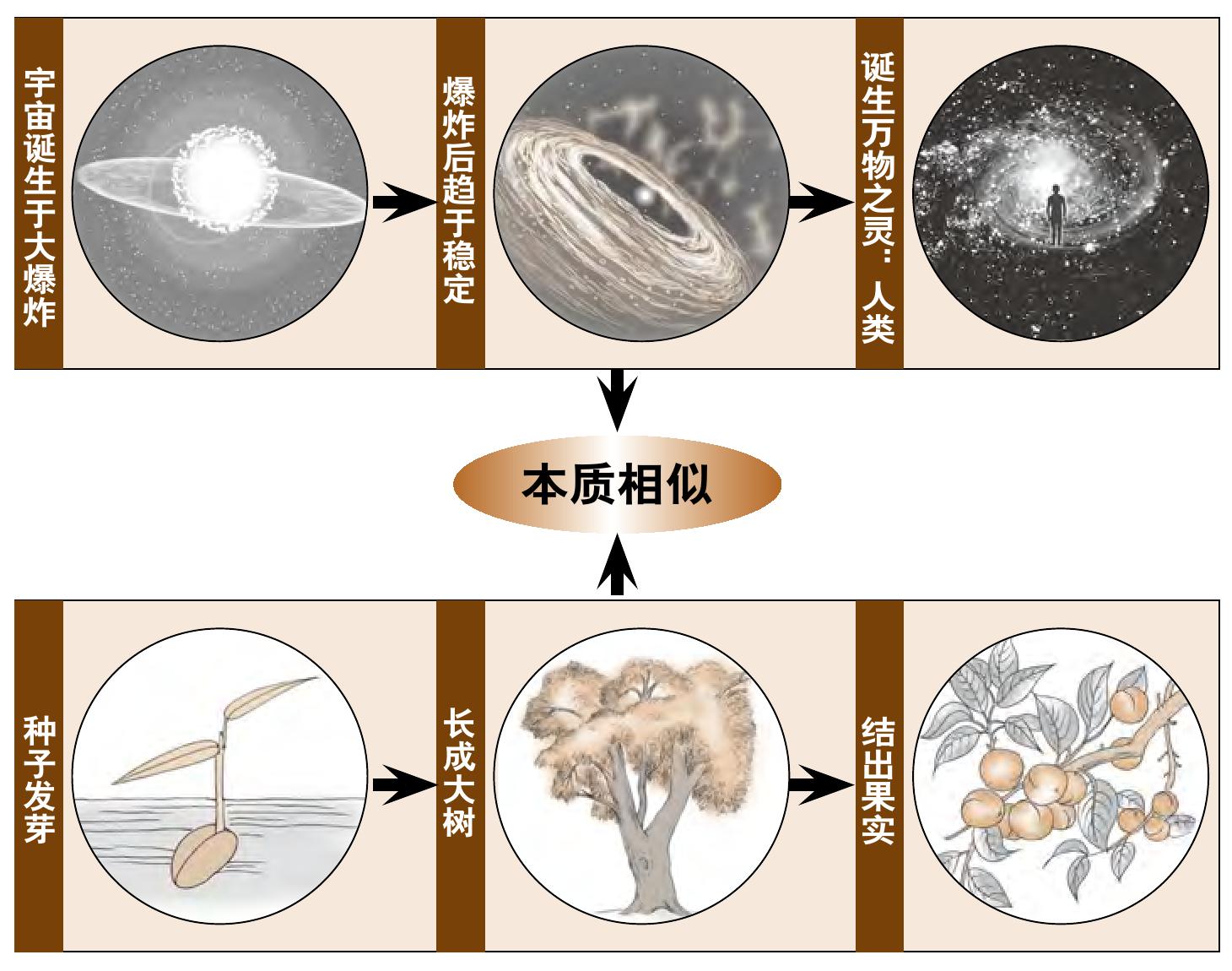 宇宙演化出人的过程相似于树木结出果实的过程。种子长成树,当树成熟后,结出的果实中又有它的种子,所以树木与其果实的本质是统一的,只是表现形式有异。宇宙与人的关系的本质与此类似。