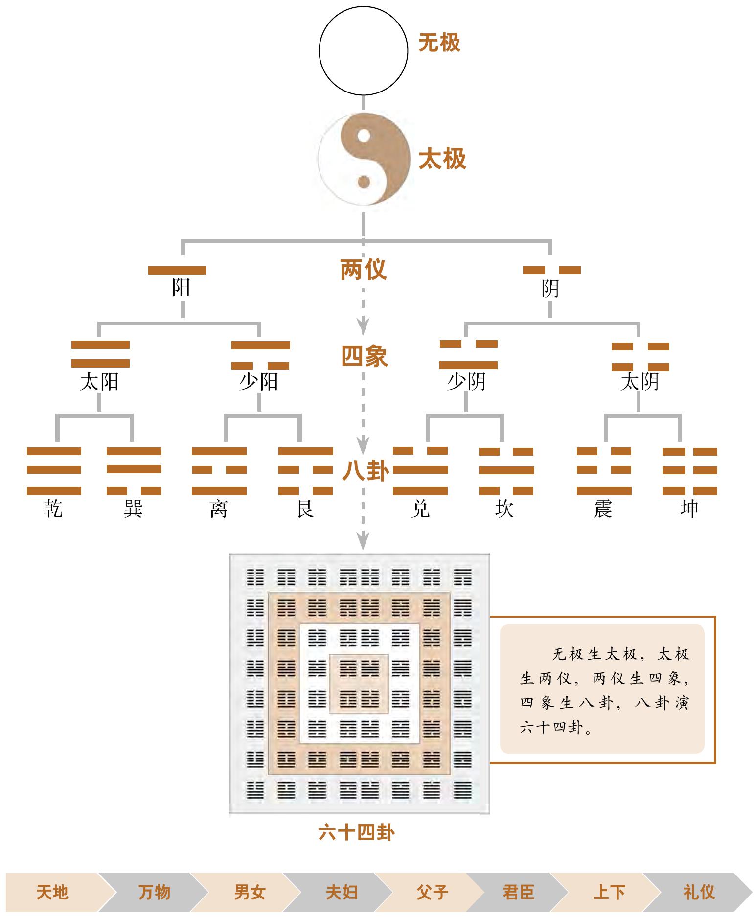 人类社会的演化规律也在于“生”,生动地把这个过程描述出来,就是言简意赅、意蕴深远的“生生”一词。宇宙从混沌未分的“无极”而来,无极动而生太极,太极分阴阳两仪,再由阴阳分化出太阴、太阳、少阴、少阳这四象,四象分化而为八卦,八卦代表着世界的八种基本属性,可以用“天地风山水火雷泽”来概括。《说卦》认为,“乾,健也;坤,顺也;震,动也;巽,入也;坎,陷也;离,丽也;艮,止也;兑,说也。”八卦又分出六十四卦,但六十四卦并不代表事物演化过程的终结。六十四卦最后两卦为“既济”和“未济”,象征事物发展到最后必然有一个结果,但这个结果作为一个“节点”,以它为开始将展开另一次全新的演变。所以,“物不可穷也,故受之以未济终焉”。这个演化的过程体现在人伦关系中,就是《易经》中说的:“天地姻酝,万物化醇,男女构精,万物化生……有天地,然后有万物;有万物,然后有男女;有男女,然后有夫妇;有夫妇,然后有父子;有父子,然后有君臣;有君臣,然后有上下;有上下,然后礼仪有所错。”