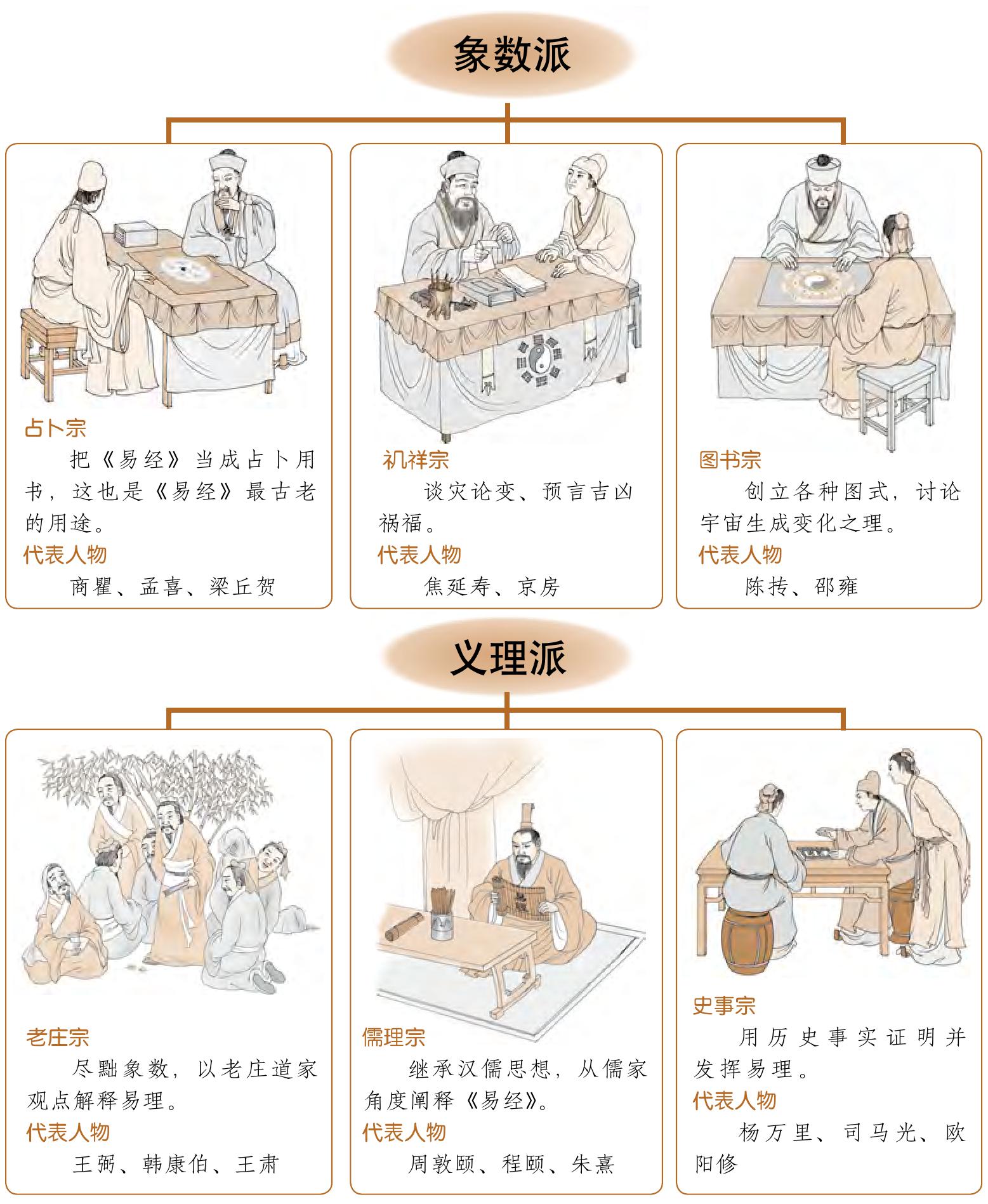 《四库全书提要》把《易经》研习流派分为两大类:象数派和义理派。象数派分为占卜、祥、图书三宗;义理派分为老庄、儒理、史事三宗。