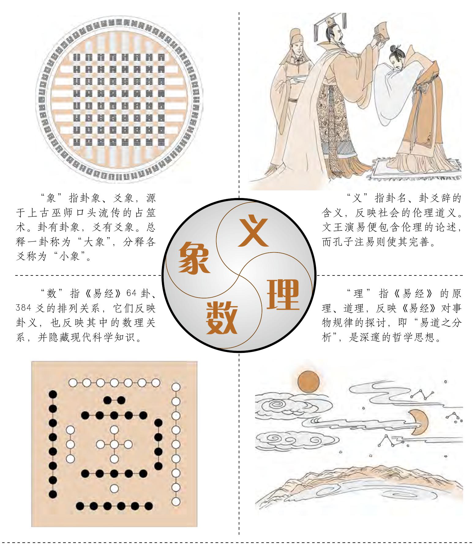 古人将易象、易数、易义、易理称为“易之四德”。简单地说,“象”是卦及其所象征的事物的形象,“数”反映卦象中的数理关系,“义”表达了伦理道义的思想,“理”是对万物的规律所做的探讨。