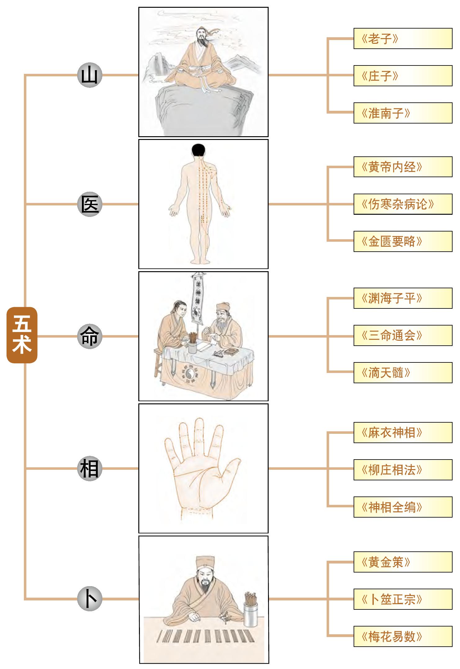 五术即“山医命相卜”,源于“一阴一阳之谓道”的思想。“五术”的概念产生于唐朝,它以《易经》为哲学根基,以追求人与自然和谐统一为目的,探窥天道运行的秩序和人生奥秘。
