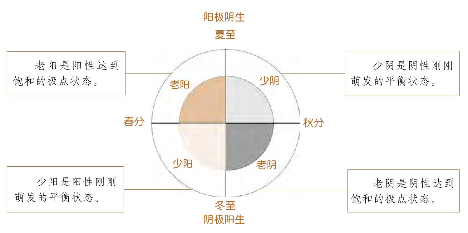 “少阳—老阳—少阴—老阴”这四象之间的变化关系非常复杂。在图中,少阳和老阴看似一样,实则不同。在少阳时,阳占据主动、积极、上升的状态;而老阴时,阴占据上升状态。少阴和老阳的关系同理。