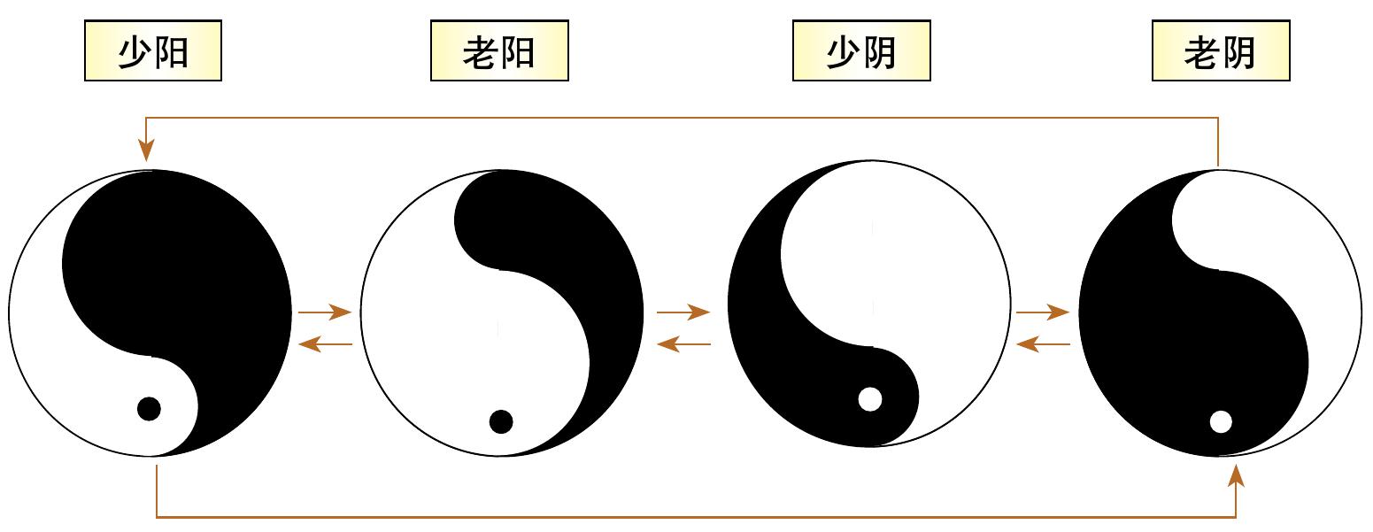 阴阳两仪对立统一,阴中有阳,阳中有阴,阳极阴生,阴极阳生,此消彼长,相互转化。根据阴阳的成分和程度的轻重,两仪又被分为四象:少阴、少阳、太阳(老阳)、太阴(老阴)。