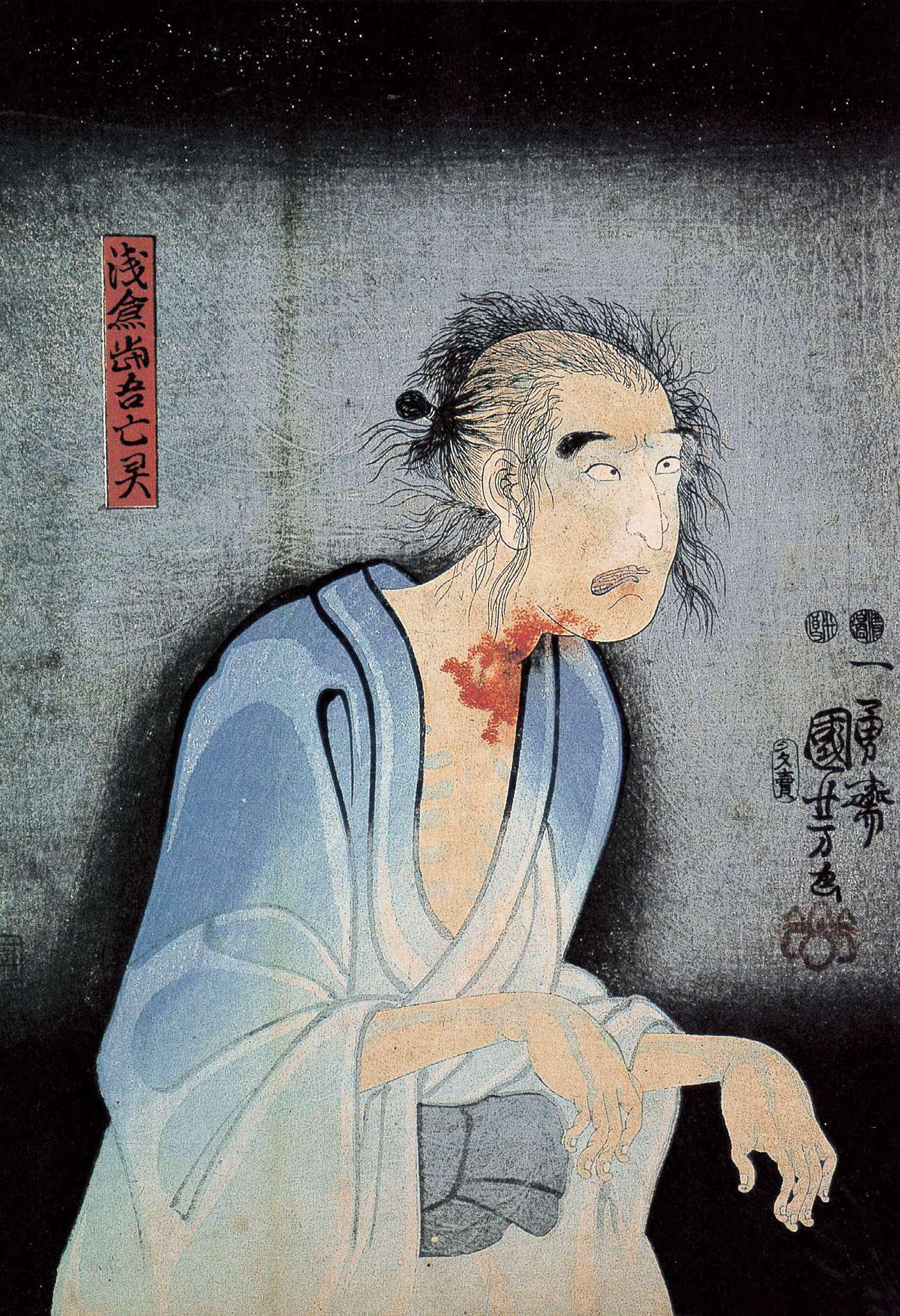 图中题词为“浅仓当吾亡灵”,虽然浅仓当吾到底是何人,至今众说纷纭,难以定论。但这决不影响我们欣赏这个诡异的灵魂,它喉咙的伤可能是其成为亡灵的根本原因,稀疏头发扎成的小髻、夸张的眼白,国芳的写实手法让它有种难以名状的妖异、恐怖及空灵。