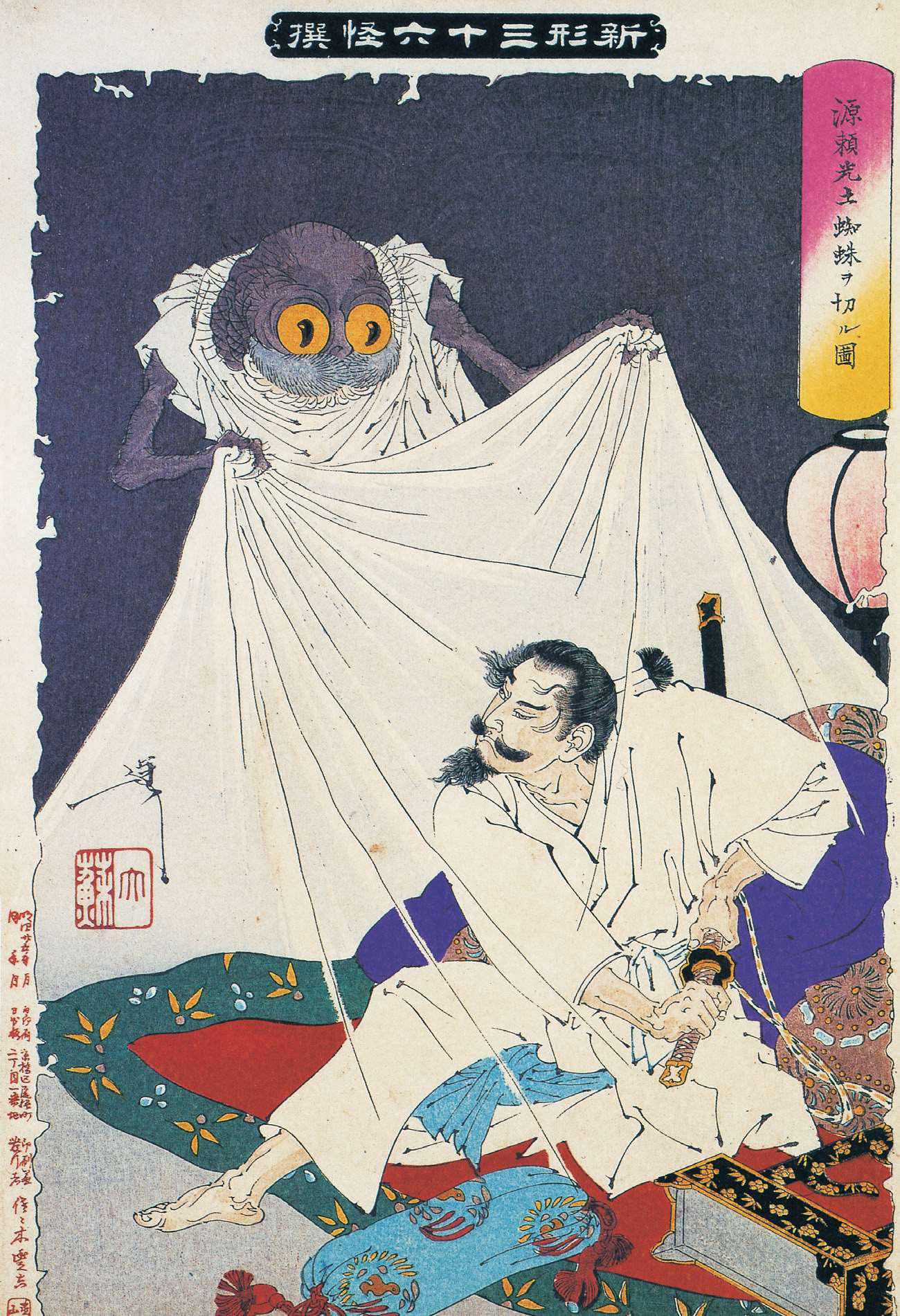 土蜘蛛是一种体形异常巨大的蜘蛛妖怪,性情残暴,常将遇见的人用蛛丝牢牢绑住,然后带回山洞里食用。它的八足、獠牙、钢毛等都是非常锐利的伤人利器。平安时代著名的武士源赖光曾只身进入山中和这种妖怪大战数时,最终将其斩杀。