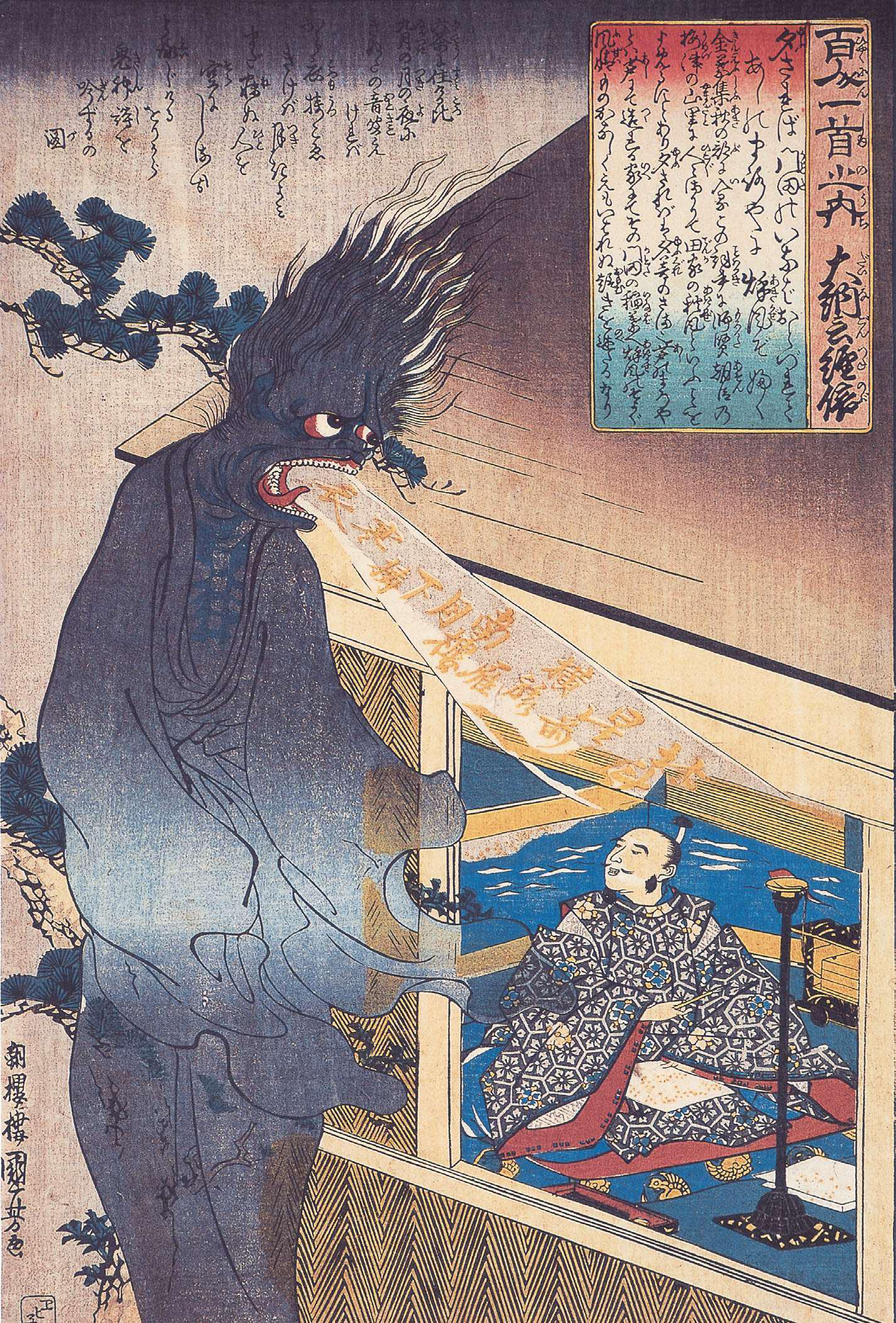 国芳在画中有“百人一首之内”的题词,“百人一首”指日本镰仓时代集合了一百位歌人作品的歌集。图中描绘的正是一位歌人沉醉于自己的歌声中,不料眼前突然出现一个一丈多高的妖怪,浑身漆黑,头发上逆,竟然跟着歌人一起和歌,吐出的歌词变成了阵阵白雾。