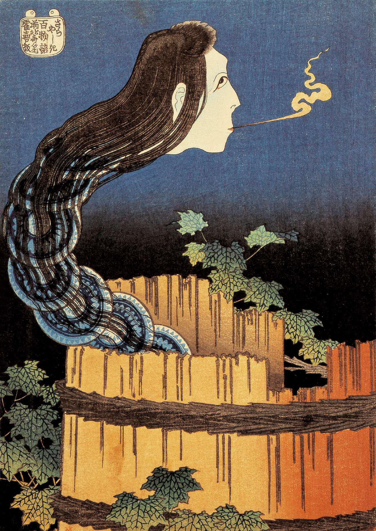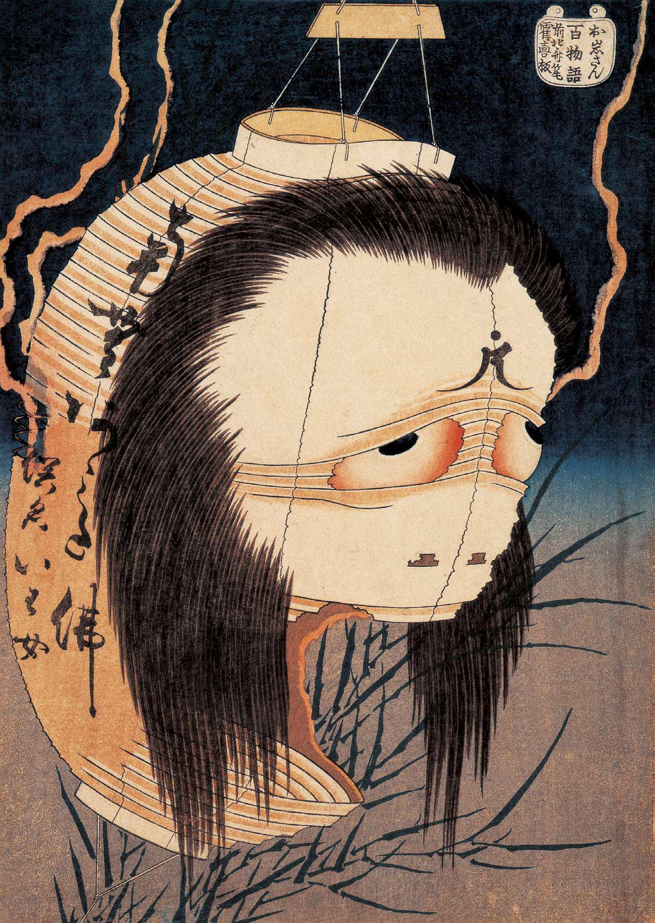 “百物语”是江户时代流行的一种游戏,就是几个朋友半夜里聚在一起,点起许多蜡烛,然后轮流说鬼故事,说完一个鬼故事就吹灭一根蜡烛。据说,当第一百根蜡烛熄灭时,真正的鬼就会出现。图中描绘的即是蜡烛全部吹灭后,各色鬼怪争相现身的情景,令人毛骨悚然。