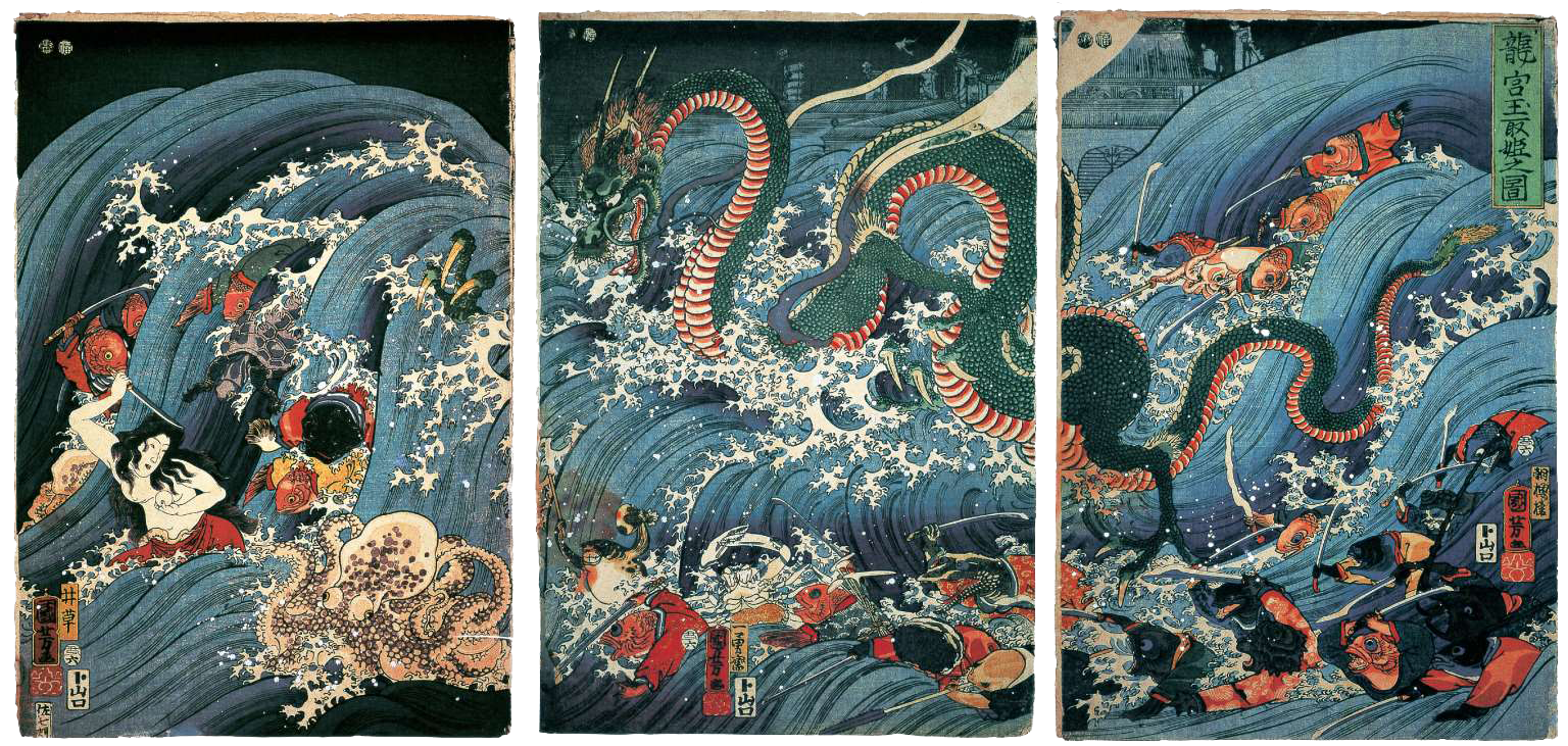 玉取姬是美丽善良的海女,其潜入龙宫盗取龙珠藏入乳房中,后来又从乳房中切下龙珠击败恶龙的故事在日本妇孺皆知。此绘画是众多玉取姬图中最完美的一幅,波涛汹涌的蓝色大海、因愤怒而翻腾身躯的恶龙、挥舞兵器的虾兵蟹将及果敢挥刀切龙珠的玉取姬,都赋予整个画面热烈、刺激、灵动的色彩。