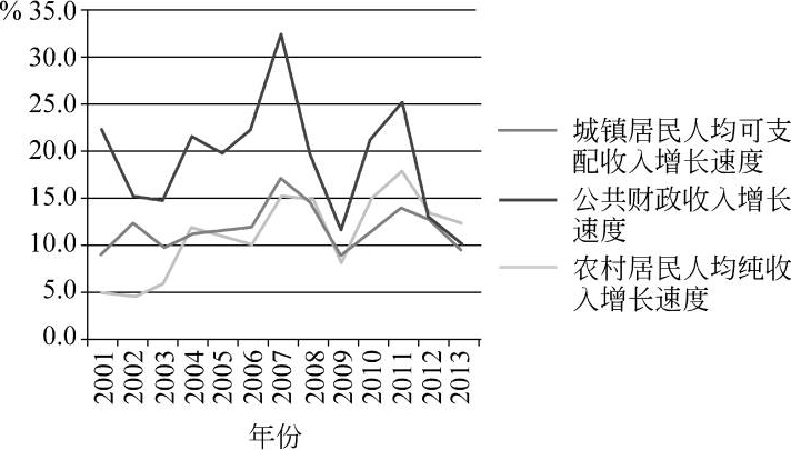 公共财政收入增长速度与城乡居民人均收入增速比较如图1-6所示。