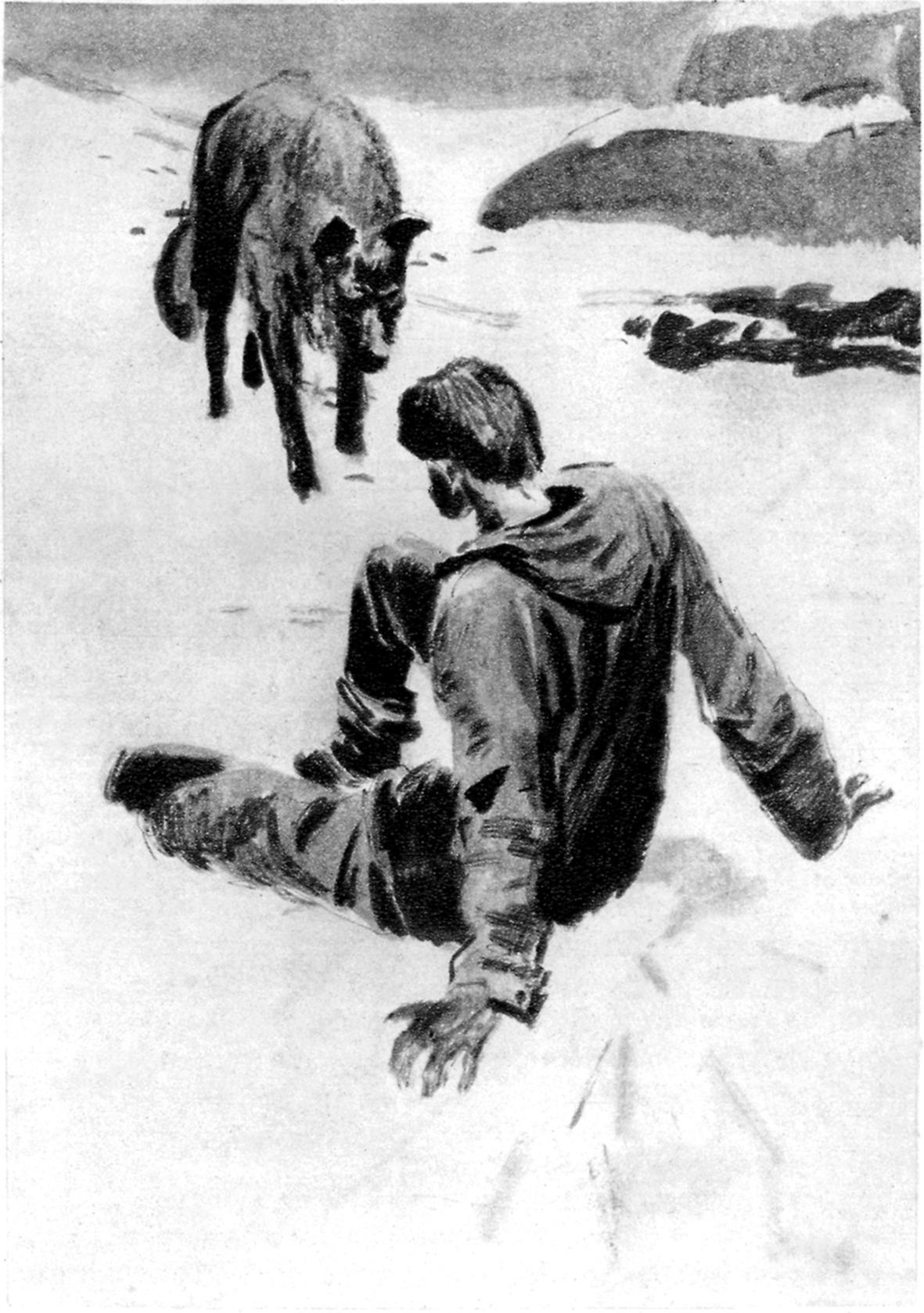 他听到背后有一种吸鼻子的声音——仿佛喘不出气或者咳嗽的声音。由于身体极端虚弱和僵硬,他极慢极慢地翻了一个身。他看不出附近有什么东西,但是他耐心地等着。又听到了吸鼻子和咳嗽的声音,离他不到二十英尺远的两块巉岩之间,他隐约看到一只灰狼的头。那双尖耳朵并不像别的狼那样竖得笔挺;它的眼睛昏暗无光,布满血丝;脑袋好像无力地、苦恼地耷拉着。这头野兽不断地在太阳光里眨眼。它好像有病。正当他瞧着它的时候,它又发出了吸鼻子和咳嗽的声音。