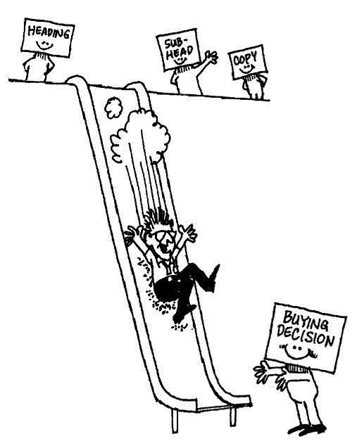 如果你能让大部分只是扫一眼杂志的人们去阅读你的广告,即使你不能向每个人都售出你的产品,也肯定会有相当一部分人会转化为你的顾客。制造出滑梯就能给广告带来“客流量”——他们会通读你的广告全文,然后决定是否要购买你的产品。