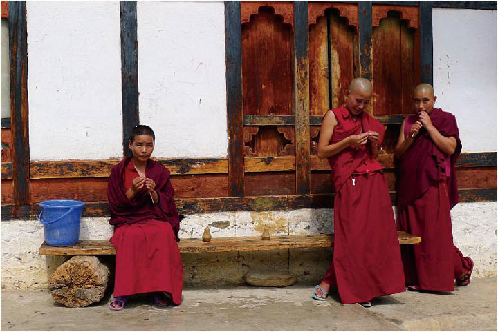 来到不丹,通信完全阻断,刚下飞机的时候,我发现根本没有手机信号,还和同伴开玩笑说,看来“全球通”也未必全球通。已经习惯了和外界无间断地联系,忽然间一切联系被隔断,非常不适应,一度担心未来几天根本无法度过,所以就请堪布想办法去购买当地的电话卡。但是安静下来,我决定不用电话,发现日子并没有想象得那样难过,依然可以保持和外界的沟通,只是这一次不是借助于通信技术,而是借助于自己的心。当心安定的时候,可以很容易地让自己高兴起来,去发现身边所有美好的事物。在打坐之余,把过往没有处理好的事情,从好的方面去理解并做好如何处理的方案;把将要进行的工作,朝着更加美好的方向规划。在夜晚入睡之前,惦念着家人与朋友,在默念中把美好的祝福送过去,相信他们可以收到而安然入睡。与外界的联系从未如此的清晰和美好,心与外界的沟通所得到的美好超越了以往任何一种互动和联系。