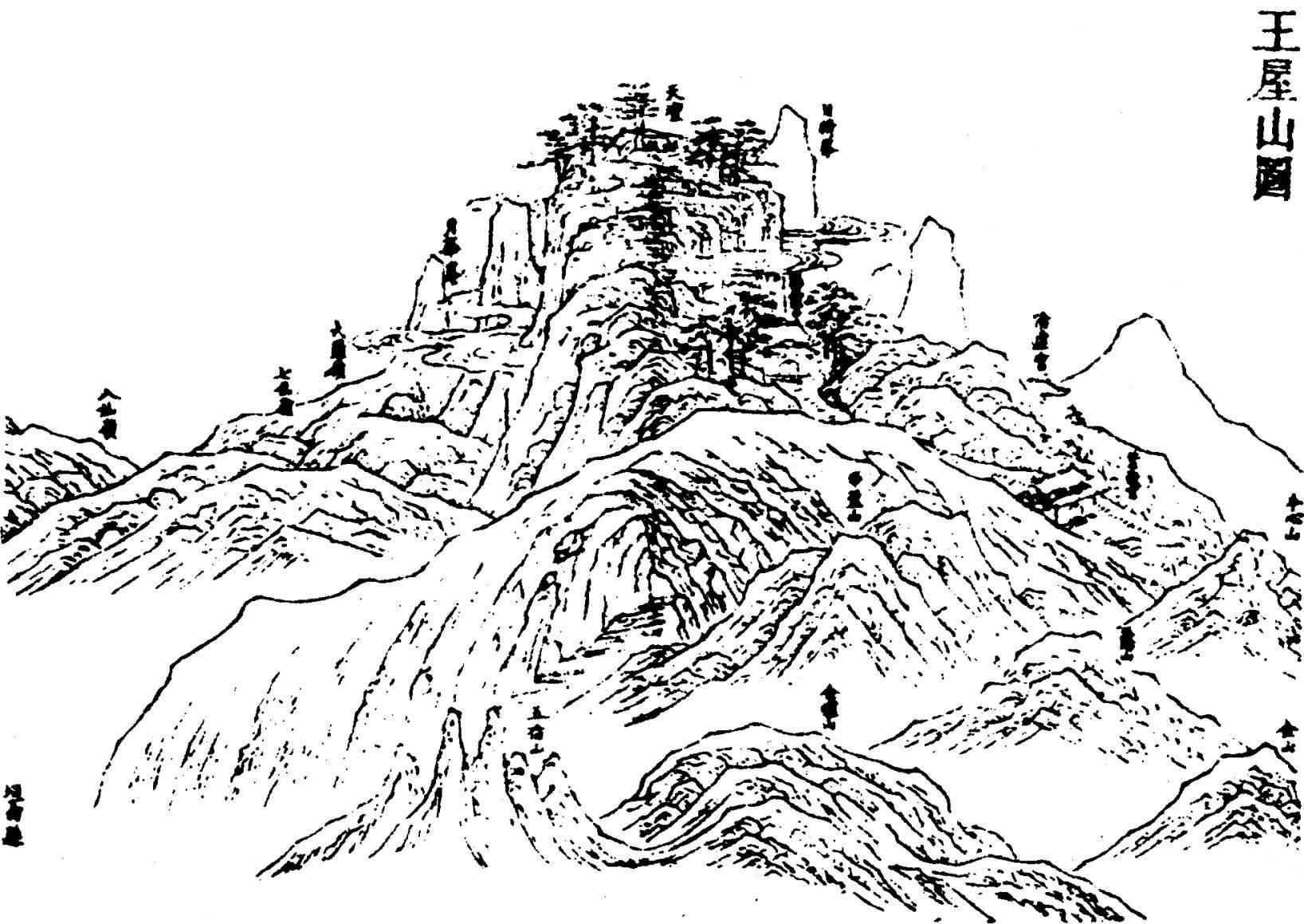 王屋山是中条山的分支,《列子》愚公移山故事即指此山。位于山西垣曲县和河南济源市之间。由石灰岩、页岩和片岩组成,山势巍峨,林木繁茂。主峰天坛山,高1771米。今有阳台宫、清虚宫等道教宫庙(图441)。