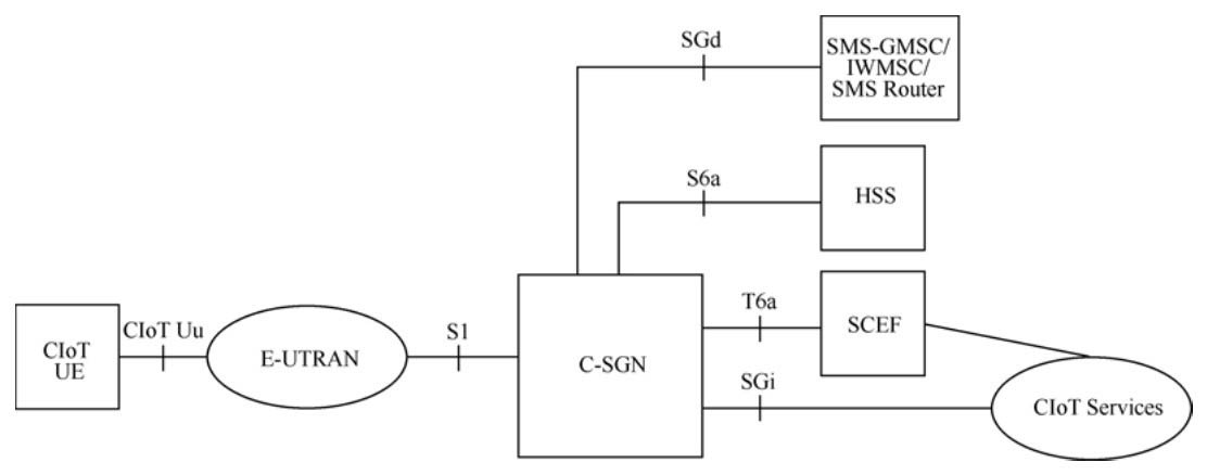在实际网络部署时,为了减少物理网元的数量,可以将部分核心网网元(如MME、S-GW、P-GW)合一部署,称之为CIoT服务网关节点(C-SGN),如图2.2所示。